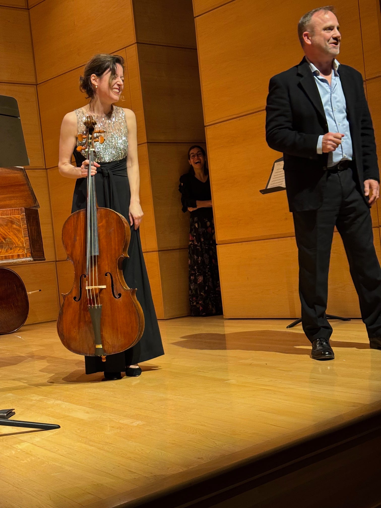 The concert was fantastic. Elinor was joined by violinists Valerie Gordon and Cristina Prats-Costa, harpsichord/composer Nicola Canzano, and bassist Shanti Nachtergaele. They played beautifully and with compelling energy. The concert showcased some of the ways that historical solfeggio can be applied in modern performance. The musicians added their own minore variations to Corelli’s Ciaccona; Elinor played her own improvised variations on Vivaldi’s Minuet (Fandango); we were treated to original compositions by Nicola and Elinor; and Elinor performed the slow movement from Leo’s F minor cello concerto having never see the score. She knows only the ‘thread’ of its syllables. A thumping rendition of Vivaldi’s variations on La Folia provided a fitting end to the concert.